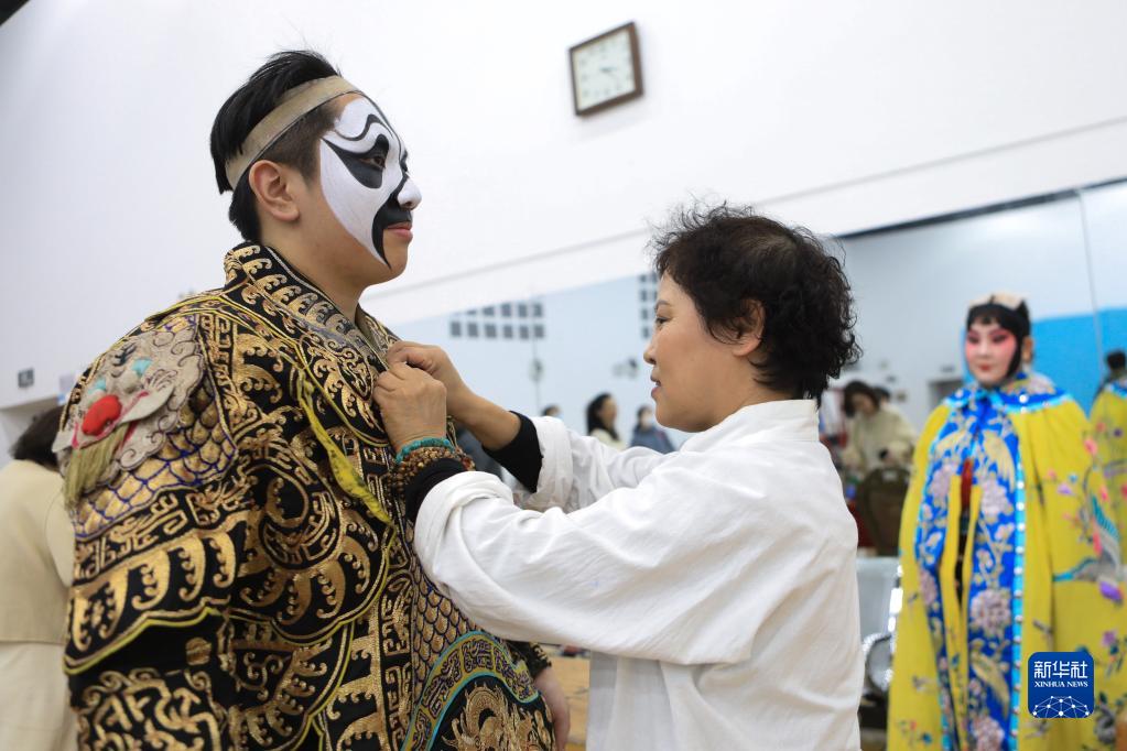 11月14日,沈陽京劇院老師為李文龍(左)穿戲服。