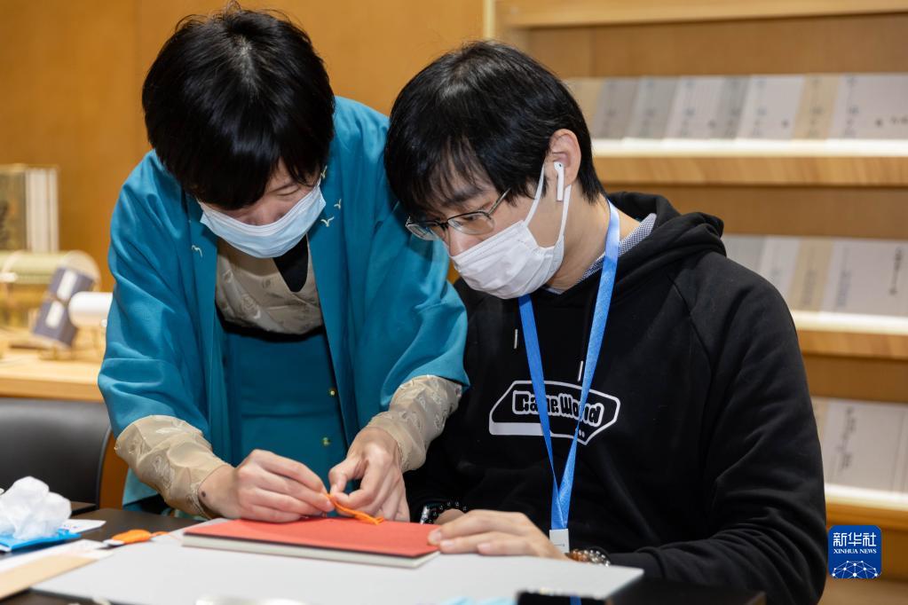 11月18日,在上海圖書館東館,古籍修復師(左)指導體驗者進行書籍裝幀。