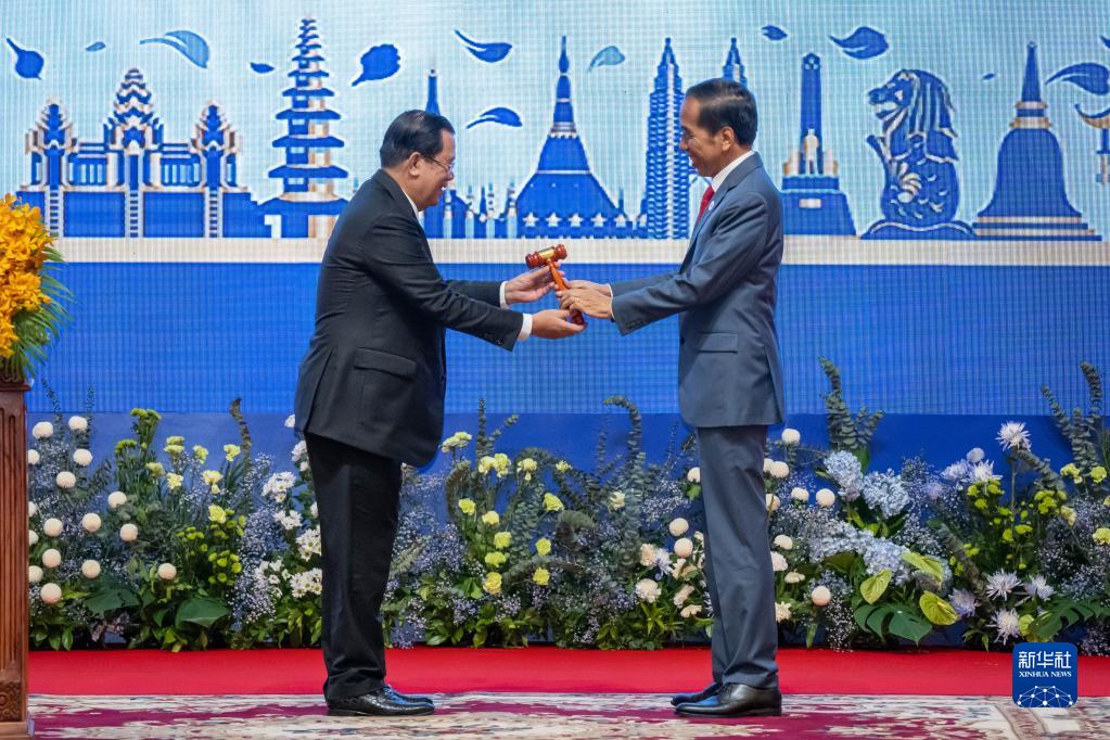 11月13日,在柬埔寨首都金邊,柬埔寨首相洪森(左)將東盟輪值主席木槌移交給2023年?yáng)|盟輪值主席國(guó)印度尼西亞總統(tǒng)佐科。
