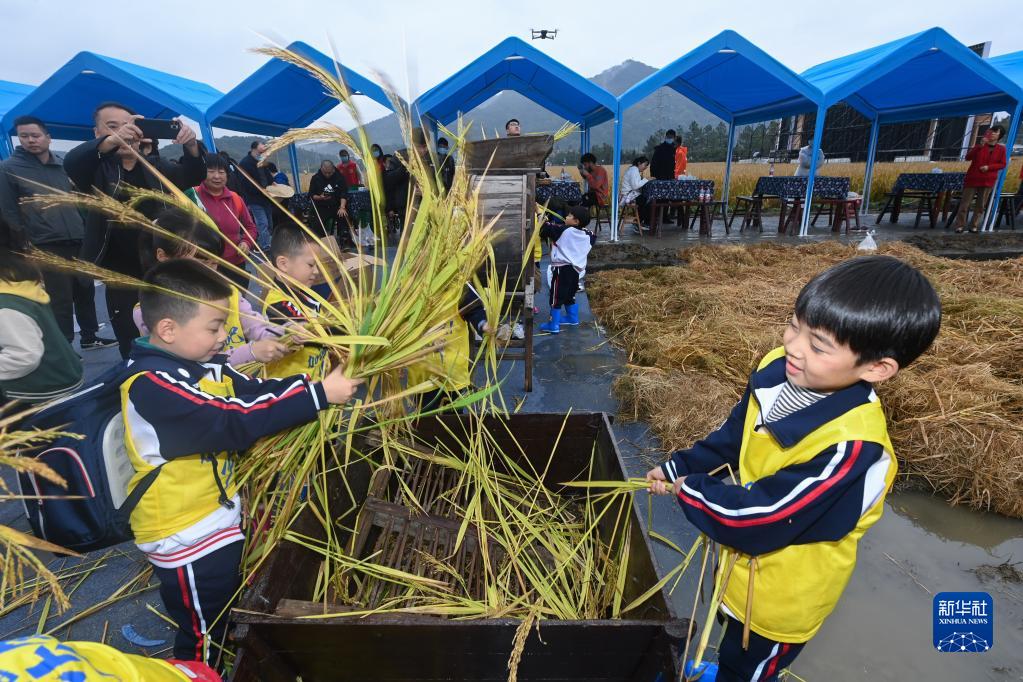 11月19日,孩子們在家長的帶領下體驗傳統打稻谷。