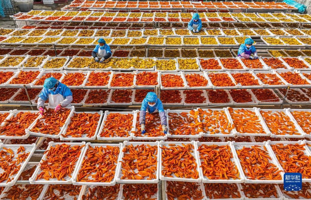 11月19日,在山東省榮成市埠柳鎮東初家村一家甘薯加工企業,工人利用晴好天氣,抓緊晾曬甘薯干。近年來,榮成市埠柳鎮成立甘薯產業合作聯社,以農產品加工企業帶動周邊農村進行甘薯規模化種植,帶動農村集體經濟的發展。