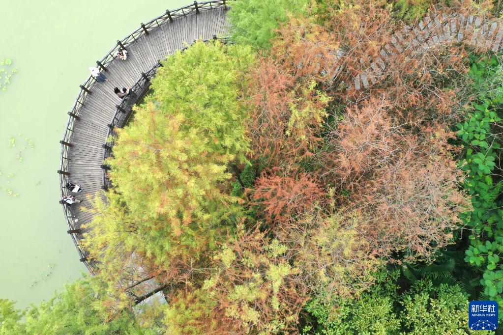 初冬時節,廣西南寧市多個公園的杉樹樹葉日漸變紅,分外靚麗。