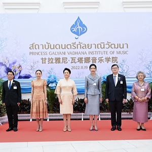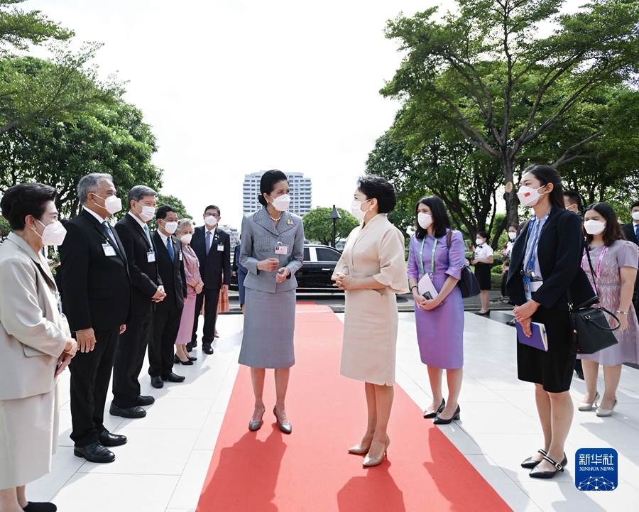 當地時間11月19日上午,國家主席習近平夫人彭麗媛在泰國總理夫人娜拉蓬陪同下參觀甘拉雅尼音樂學院。這是彭麗媛抵達時,娜拉蓬等熱情迎接。