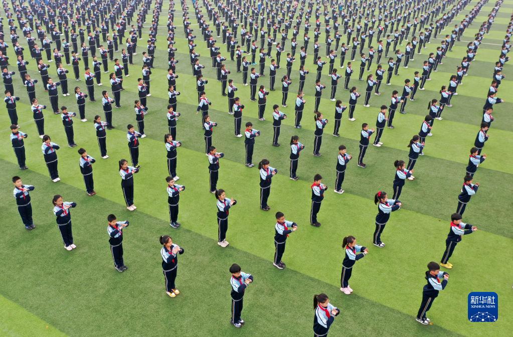 天津師范大學第三附屬小學的學生在操場上做武術健身操(11月18日攝,無人機照片)。
