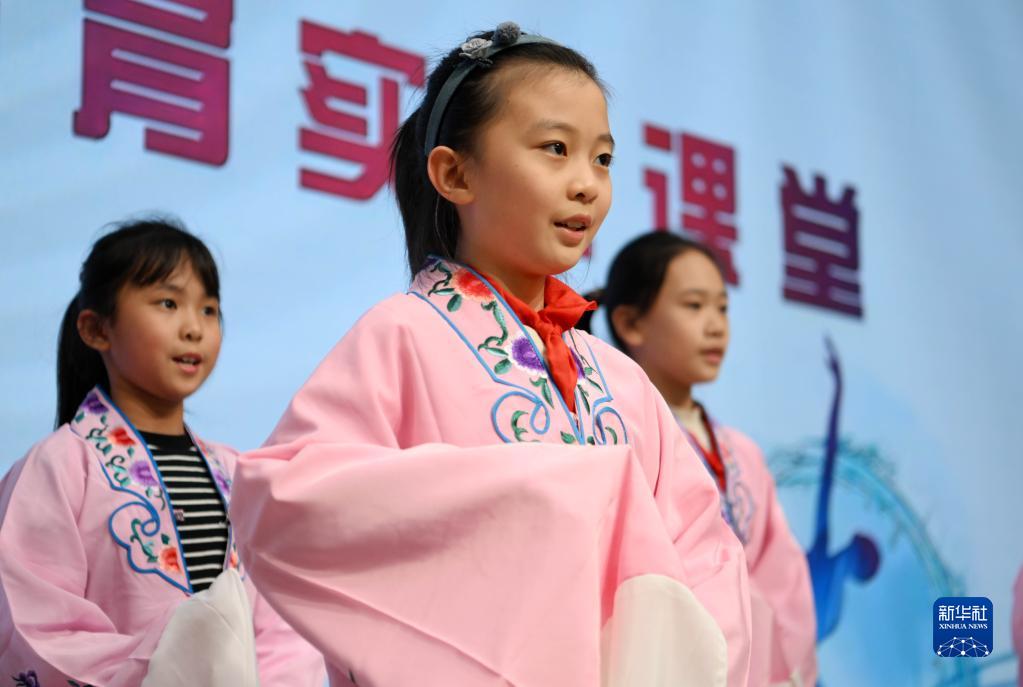 天津師范大學第三附屬小學的學生在練習京劇(11月15日攝)。