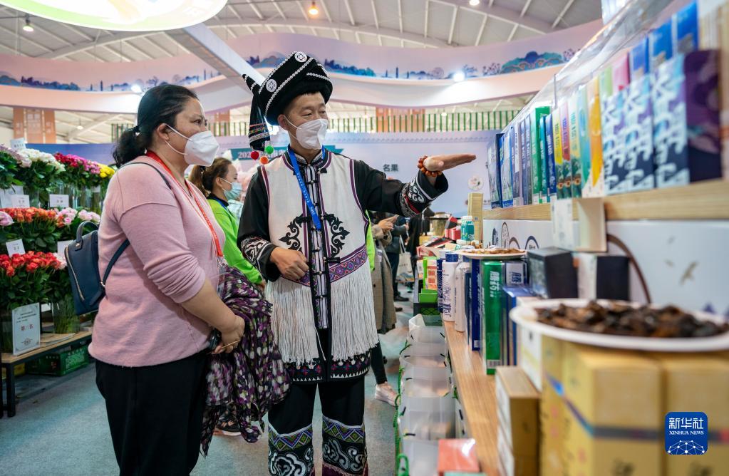 11月19日,一名參展商(右)在南博會現場介紹特色商品。