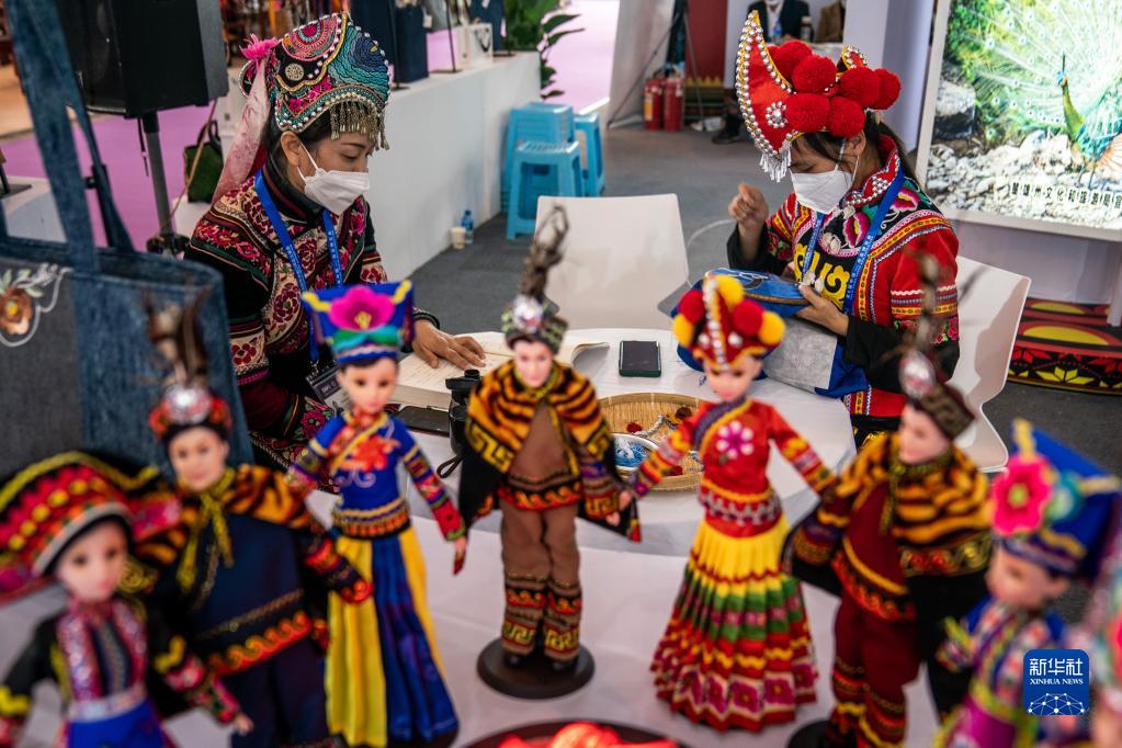 11月19日,南博會楚雄展區的參展商在現場展示彝繡技藝。