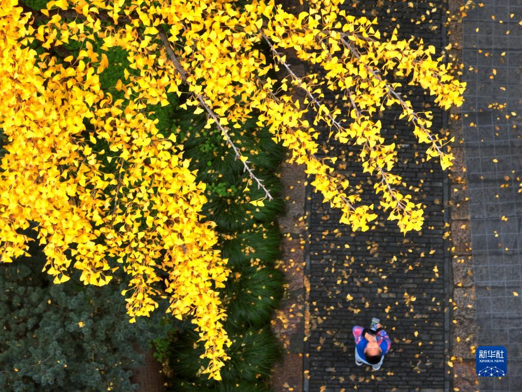 11月19日,游人在江蘇省揚(yáng)州市史可法紀(jì)念館的銀杏樹下游玩(無人機(jī)照片)。
