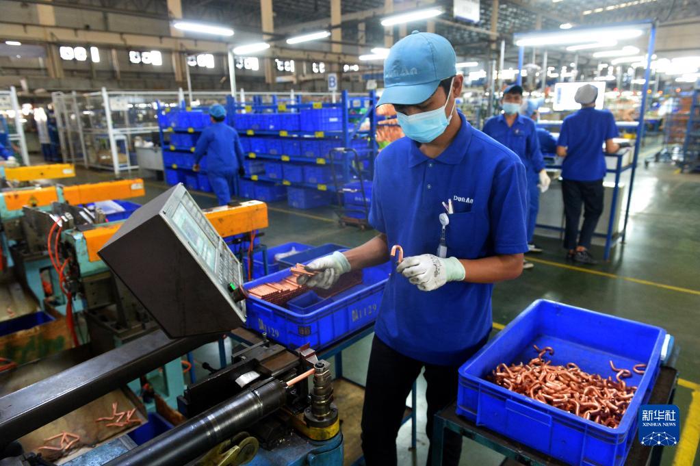 11月8日,在位于泰國羅勇府的泰中羅勇工業園,工人在盾安金屬(泰國)有限公司生產線上工作。