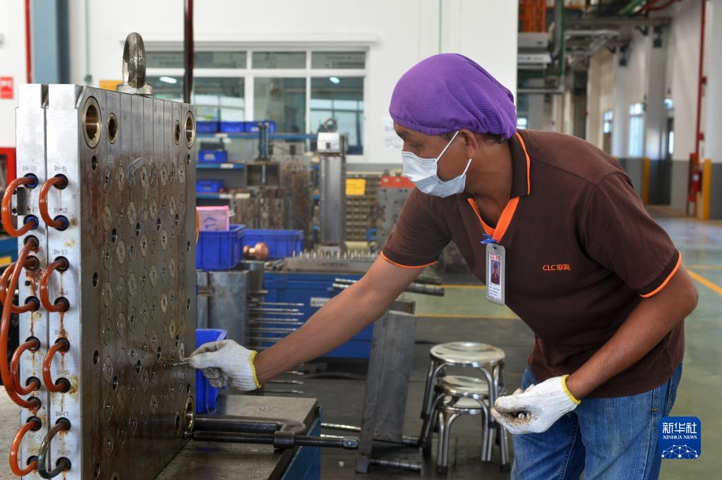 11月8日,在位于泰國羅勇府的泰中羅勇工業園,泰國工人威戚在聯昌(泰國)噴霧泵有限公司生產線上工作。威戚說:“在中國企業工作比較穩定,我的生活變得更好了。”