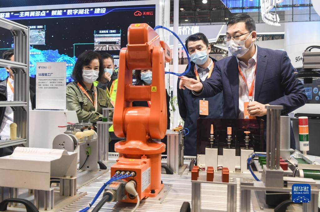 11月20日,工作人員向參觀者介紹5G智能工廠生產場景。