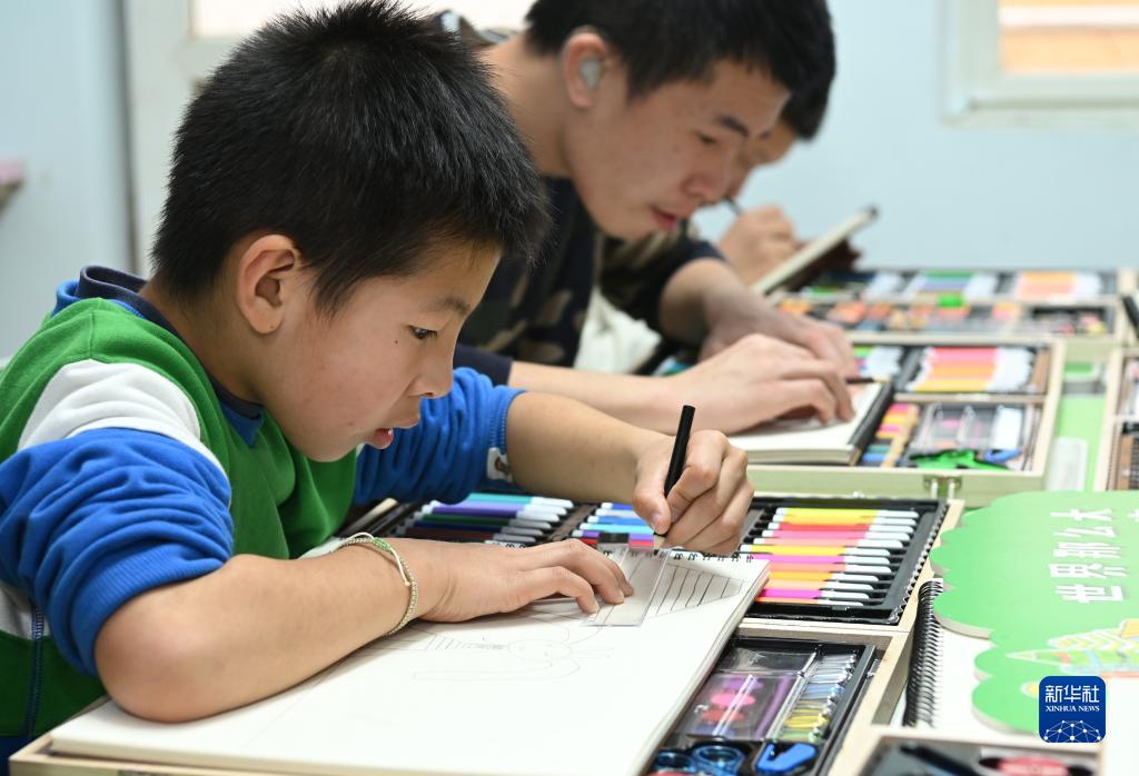 11月20日,在北京市通州區北京妙語語言矯正康復技術中心,拿到捐贈繪畫用具的孩子們在畫畫。