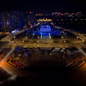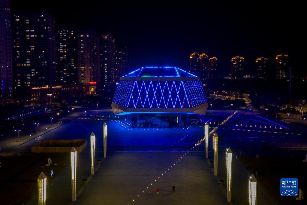 11月20日,哈爾濱音樂廳為世界兒童日亮燈(無人機照片)。