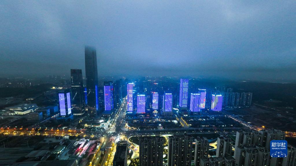 11月20日,貴陽市觀山湖區部分建筑為世界兒童日亮燈(無人機照片)。