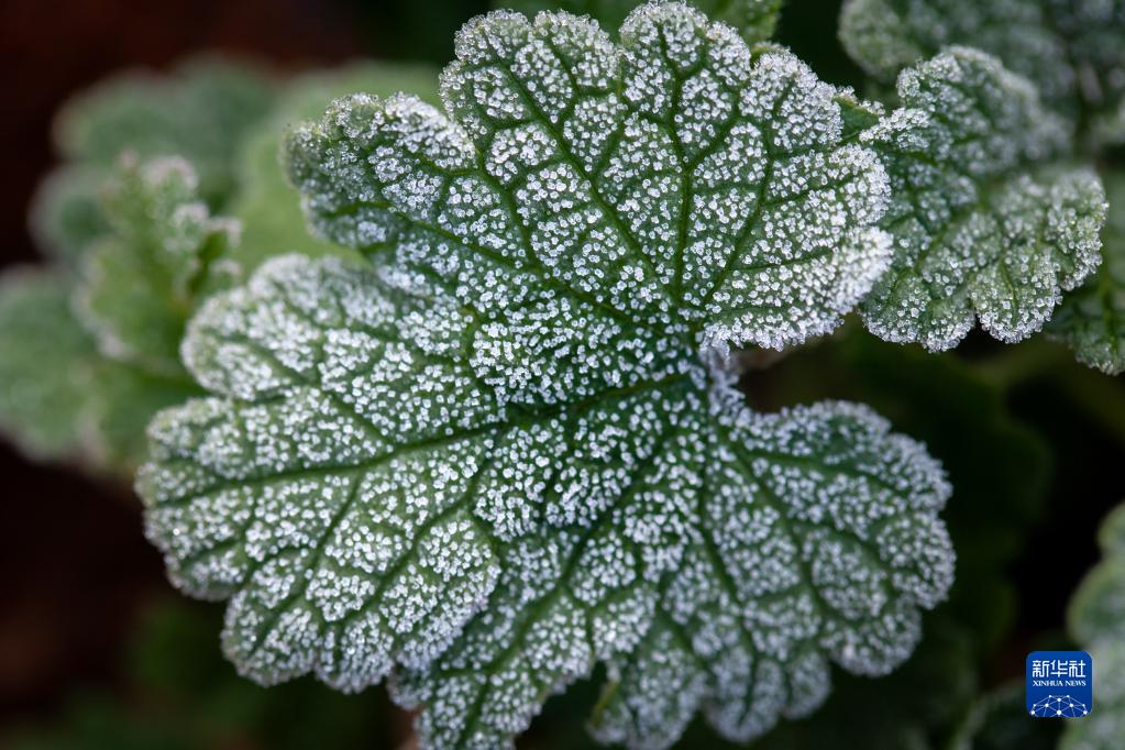 11月17日,在山東省淄博市高青縣,植物葉子上凝結了一層晨霜。