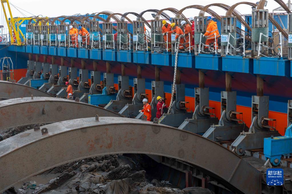 采用世界首創的“弧形梁非接觸文物整體遷移技術”, 我國迄今水下考古發現的體量最大的木質沉船——長江口二號古船21日在長江口水域成功實施整體打撈。隨著打撈進展有序推進,21日清晨,長江口二號古船船體已局部露出水面,初露真容。