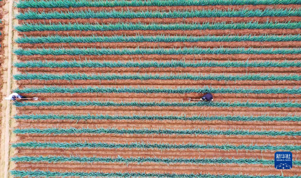 11月21日,山東省臨沂市郯城縣郯城街道農民在田間管理大蔥(無人機照片)。