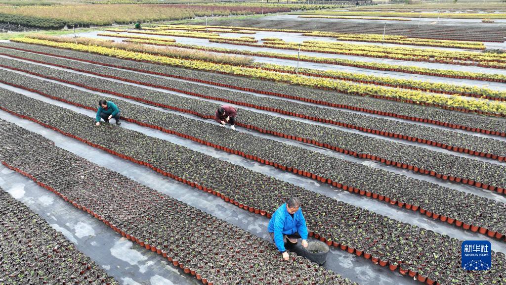 11月20日,在浙江省湖州市德清縣莫干山鎮(zhèn)高峰村千畝苗木種植基地,農(nóng)民在管護(hù)苗木(無(wú)人機(jī)照片)。