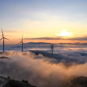 11月20日,在湖南省桂陽縣,風力發電機與云海景觀相互映襯(無人機照片)。
