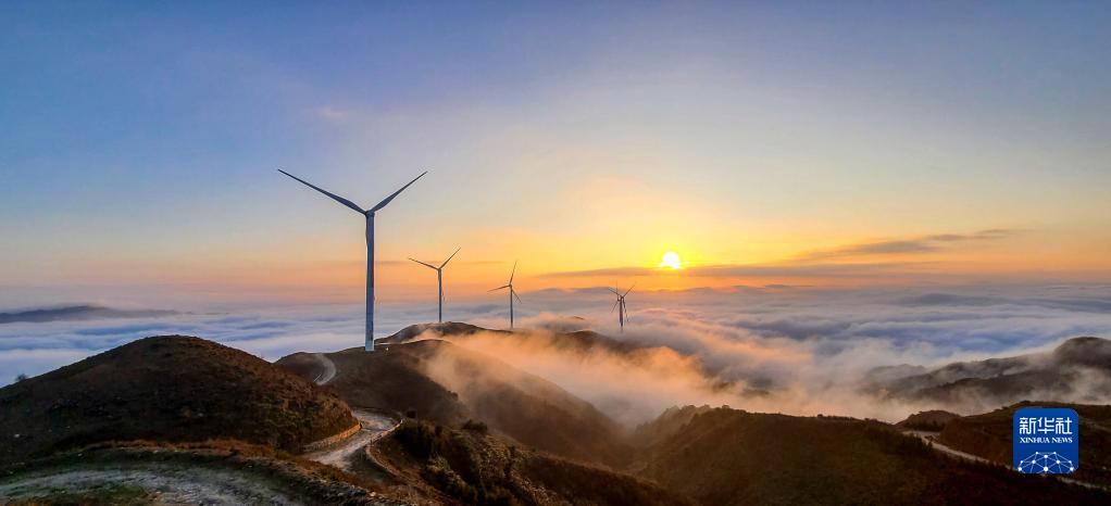 11月20日,在湖南省桂陽縣,風力發電機與云海景觀相互映襯。