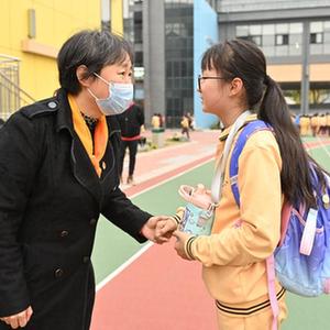 11月18日,在北京第二實驗小學(xué),蘆詠莉與學(xué)生握手交流。