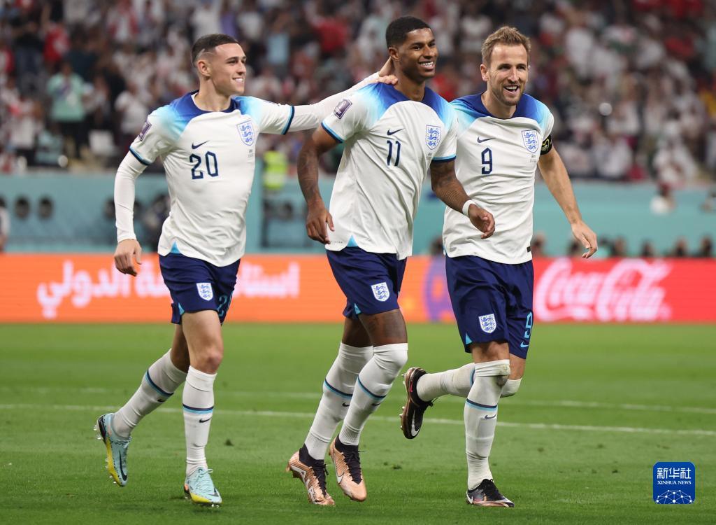 11月21日,英格蘭隊球員拉什福德(中)進球后與隊友福登(左)、凱恩慶祝。
