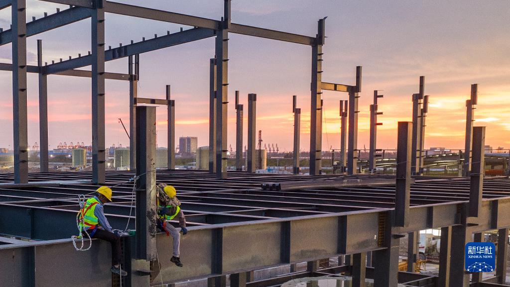 這是黨員突擊隊成員在建設廣西中偉新能源科技有限公司新能源材料基地一期工程(2021年8月27日攝,無人機照片)。