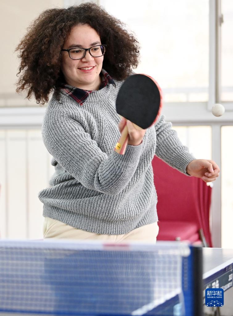 11月20日,艾茉莉在南開大學(xué)的一間活動(dòng)室內(nèi)打乒乓球。