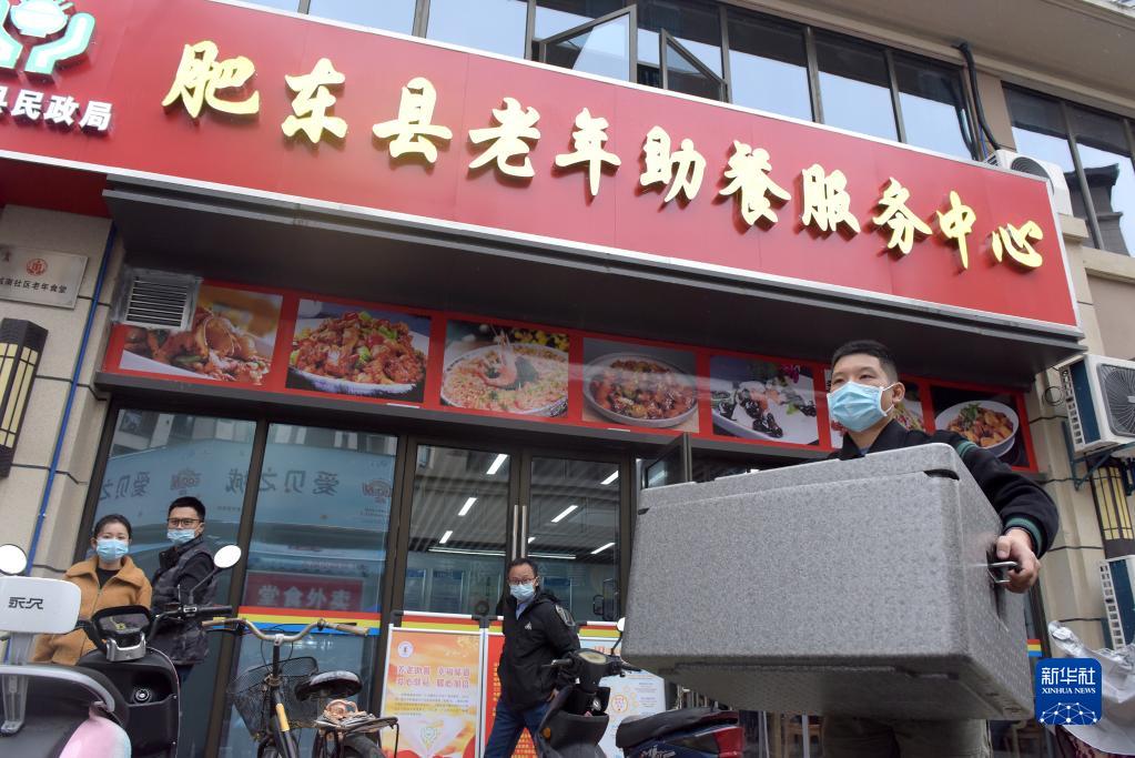 11月22日,在安徽省合肥市肥東縣老年助餐服務中心前,肥東縣老年助餐服務中心經理李杰(右一)將打包好的午餐往周邊老人家中配送。