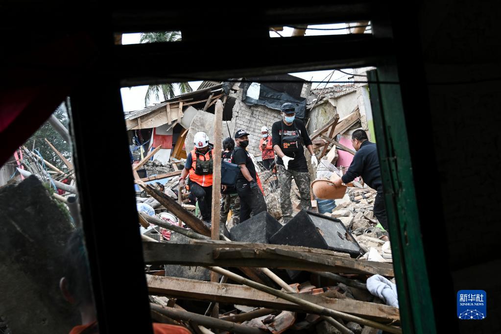 11月23日,人們在印度尼西亞西爪哇省展玉地區地震受損建筑的廢墟中進行搜救。