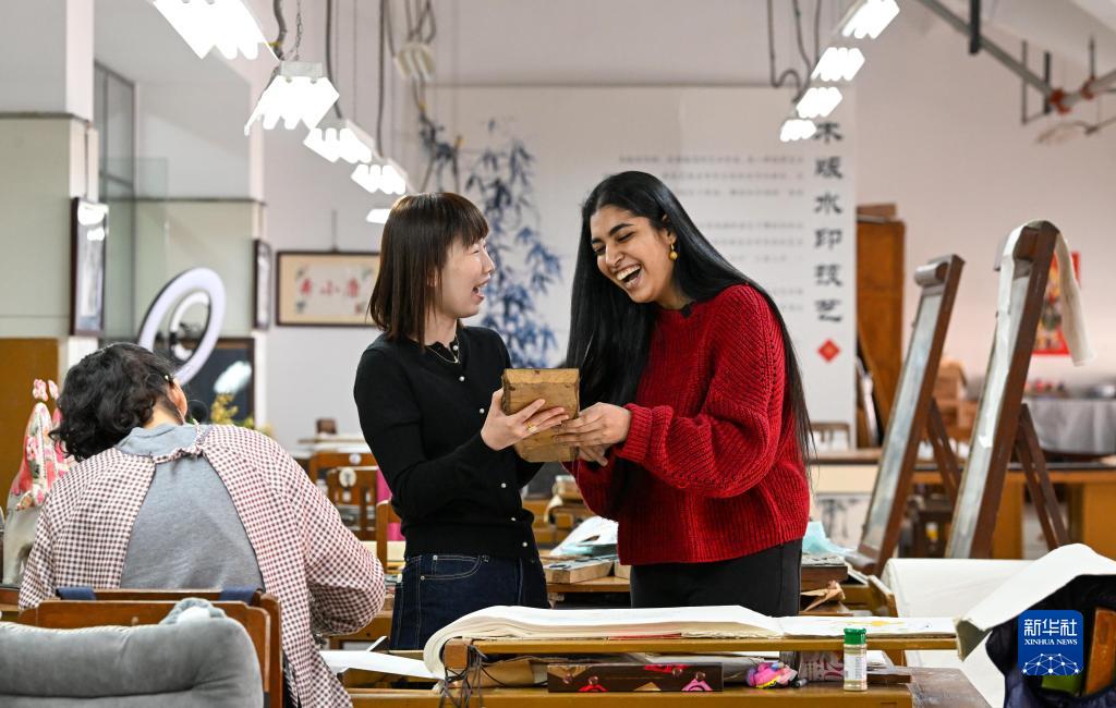 在天津楊柳青木版年畫博物館勾描工作室,天津楊柳青畫社彩繪藝人王艷(中)與辛格就木版水印技藝交談(11月17日攝)。