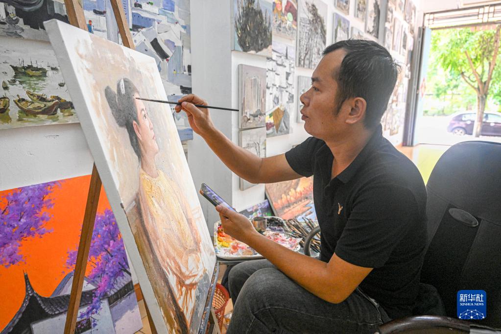 11月23日,一名畫師在海南省屯昌縣油畫步行街一家畫廊內作畫。
