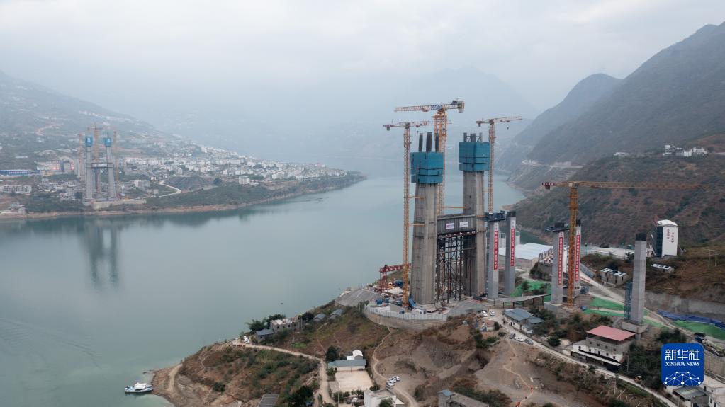 這是11月23日拍攝的卡哈洛金沙江大橋施工現場(無人機照片)。
