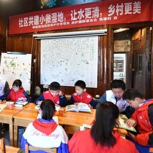 學(xué)生和志愿者在江西省九江市都昌縣樟樹許村的候鳥書屋閱讀候鳥相關(guān)書籍(11月23日攝)。