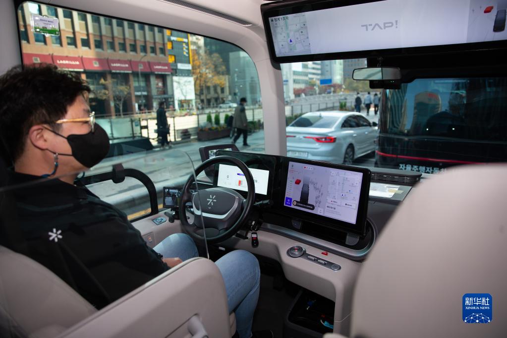 11月24日,在韓國首爾,自動駕駛巴士的安全員坐在駕駛室觀看顯示屏。