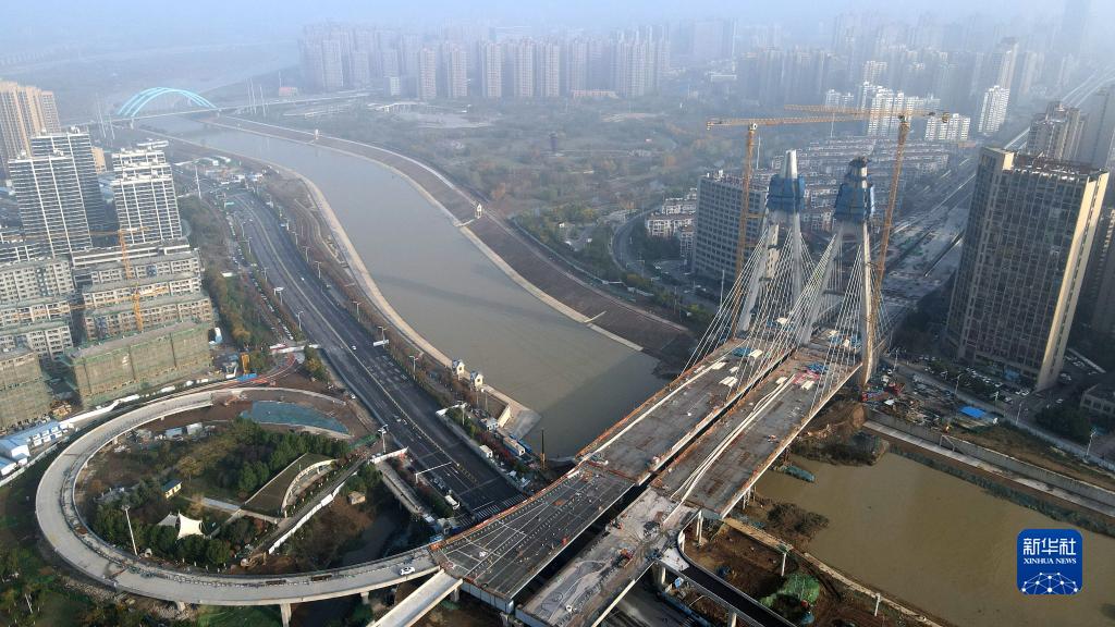 這是正在進行主塔封頂施工的引江濟淮金寨南路橋(11月24日攝,無人機照片)。