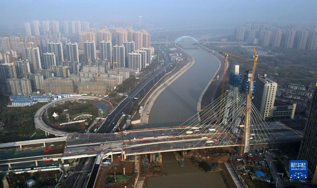 這是正在進行主塔封頂施工的引江濟淮金寨南路橋(11月24日攝,無人機照片)。