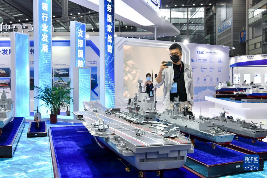 11月24日,觀眾在海博會現場觀看中國船舶集團展出的船只模型。