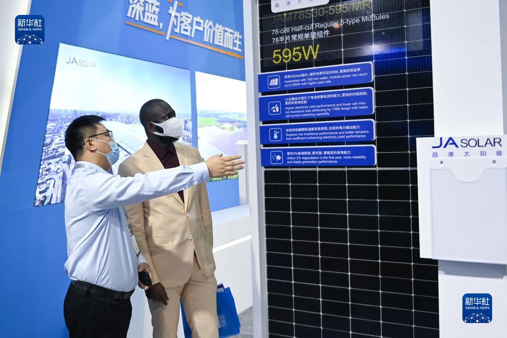 11月24日,在義博會新能源主題展區(qū),參展商(左)向一位塞內(nèi)加爾客商介紹參觀太陽能光伏產(chǎn)品。