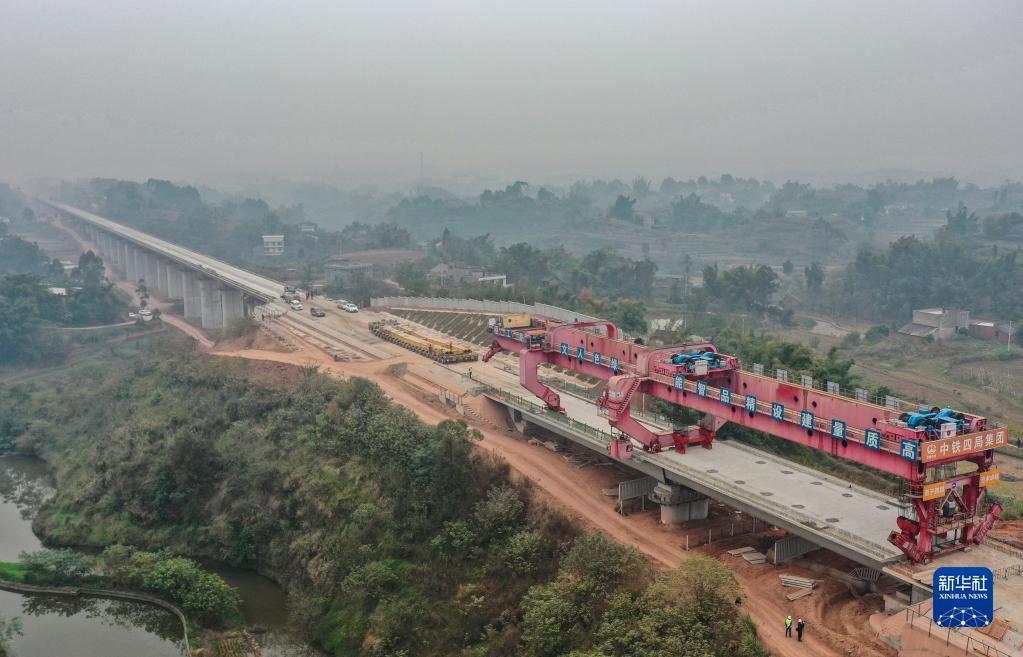 這是11月24日拍攝的渝昆高鐵瀘宜段架梁施工現場(無人機照片)。