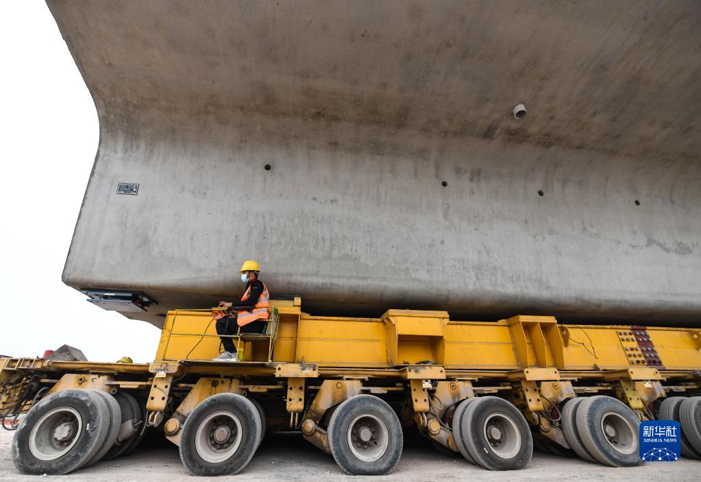 11月24日,在渝昆高鐵瀘宜段架梁施工現(xiàn)場(chǎng),施工人員操作架梁車運(yùn)送箱梁。
