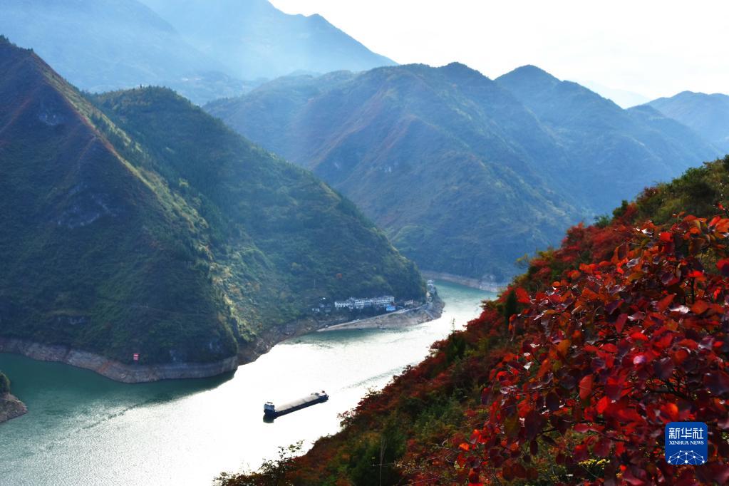 11月24日,輪船航行在紅葉映襯下的長江巫峽水域。