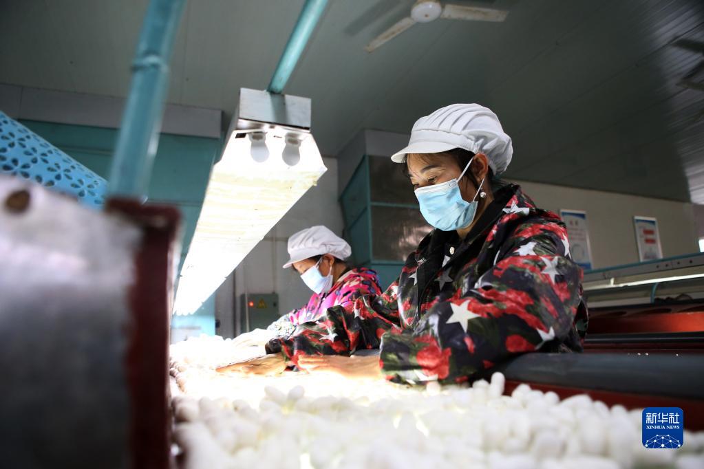 11月23日,工人在重慶市黔江區一家絲綢公司生產車間分揀蠶繭。