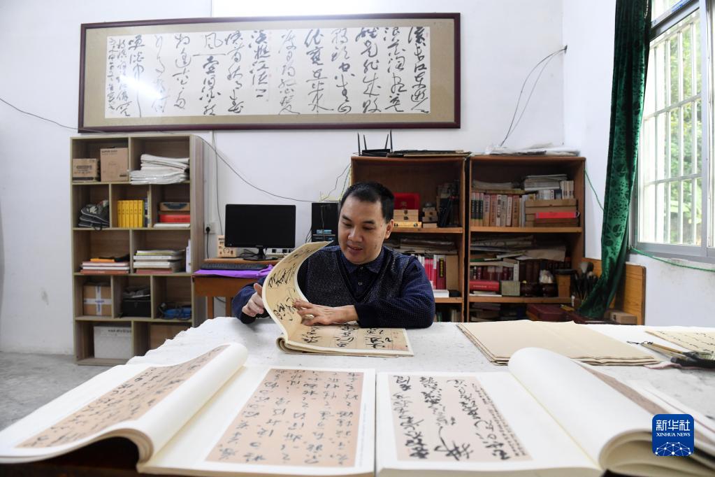 11月24日,在都安瑤族自治縣大興鎮(zhèn)九頓村那內屯家里,王金寶在研究字帖。