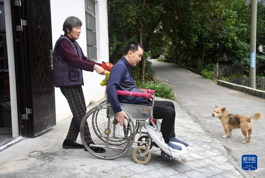 11月24日,在都安瑤族自治縣大興鎮(zhèn)九頓村那內(nèi)屯,77歲的母親用輪椅推著王金寶出門散心。王金寶受傷殘疾后,都是母親在照顧他。
