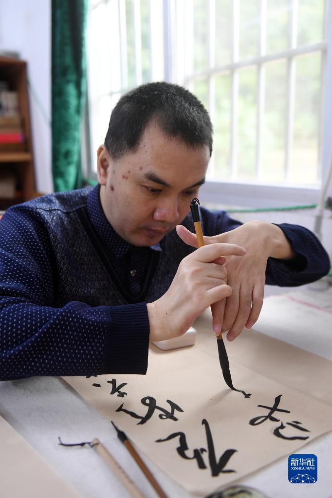 11月24日,在都安瑤族自治縣大興鎮九頓村那內屯家里,王金寶在練習書法。