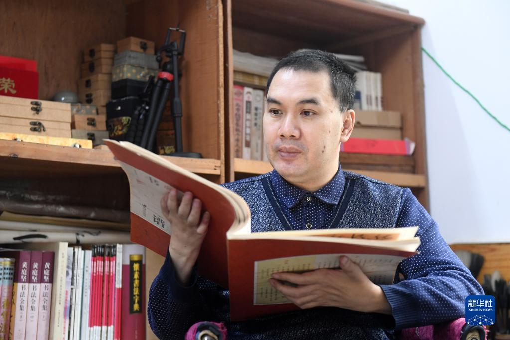 11月24日,在都安瑤族自治縣大興鎮九頓村那內屯家里,王金寶在研究字帖。