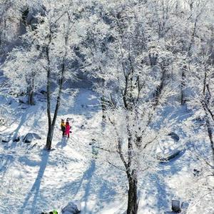游客在吉林市萬科松花湖度假區觀賞高山霧凇景觀(11月15日攝,無人機照片)。