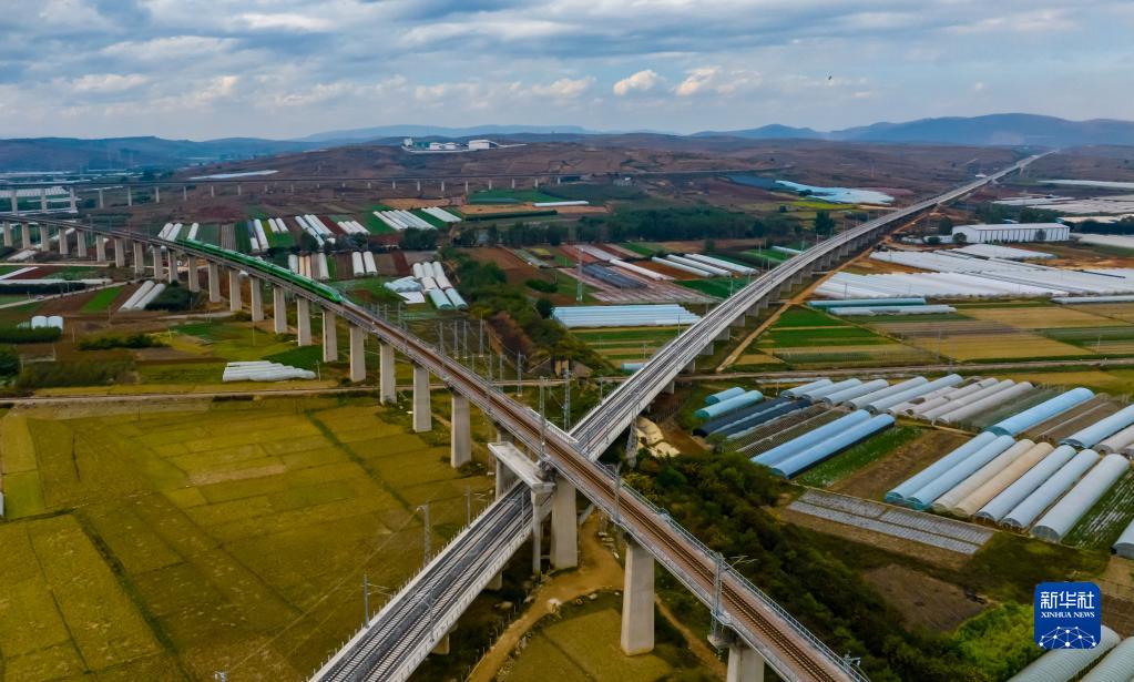 11月24日,列車(chē)行駛在中越國(guó)際通道昆明至河口鐵路,下層為彌蒙高鐵線(xiàn)(無(wú)人機(jī)照片)。