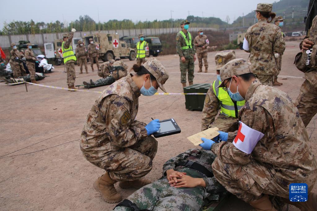 11月20日,在“衛勤力量-2022A1”基地化訓練中,野戰醫院分類處置組對批量“傷員”進行檢傷分類。新華社發(張怡涵 攝)
